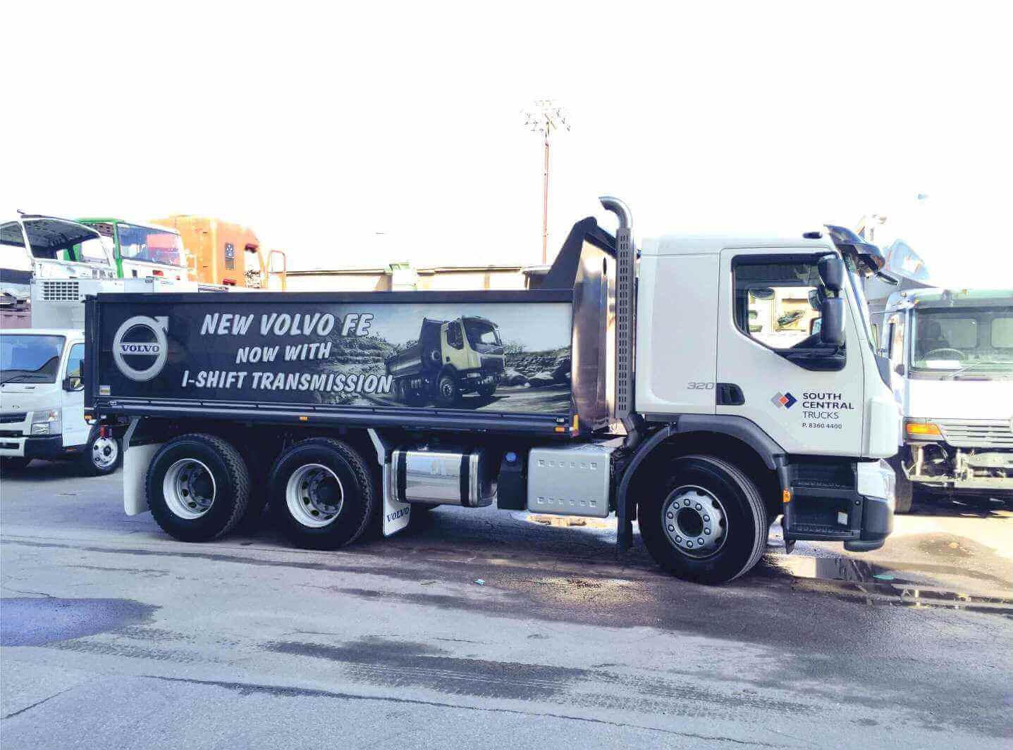 A Tandem trailer tipper, with a large format digital sign applied to the back of the truck and the companies name and logo applied via a vinyl sign to the cabin