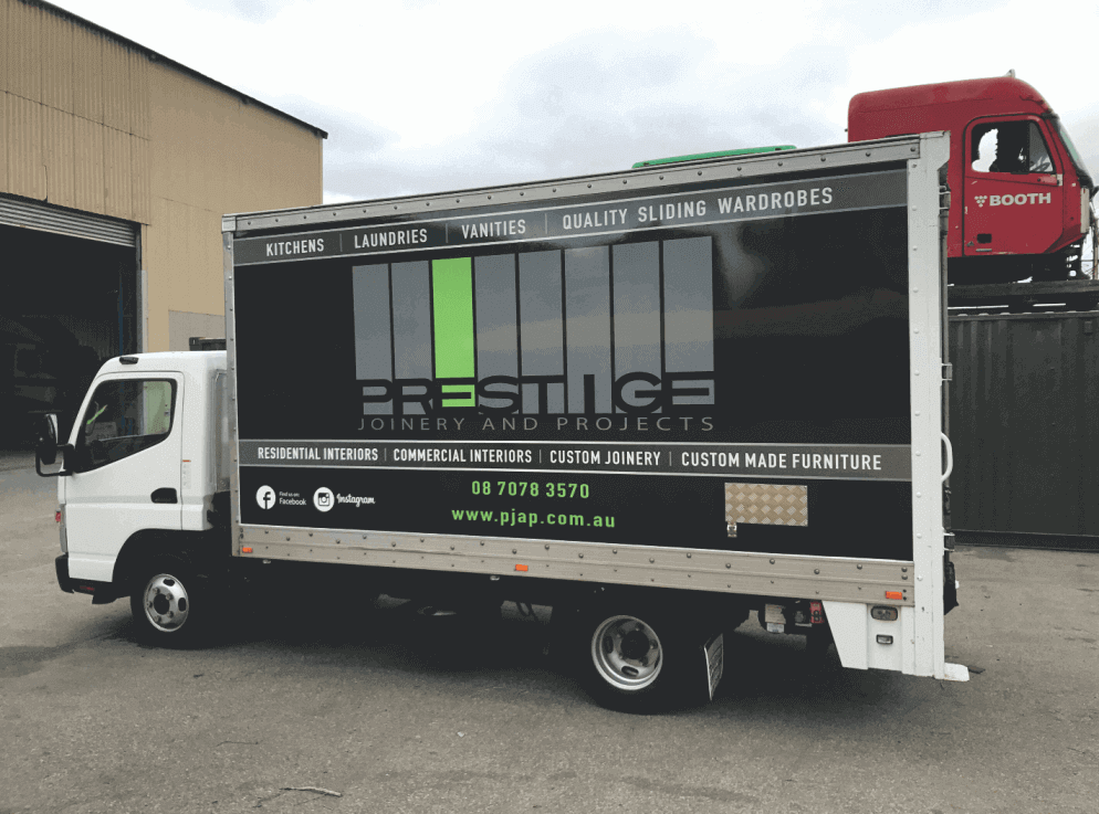 A delivery tuck that has a vehicle wrap style large format sign which is a reproduction of the company’s website