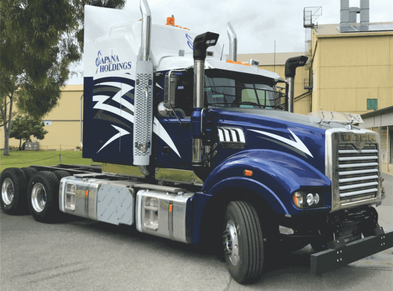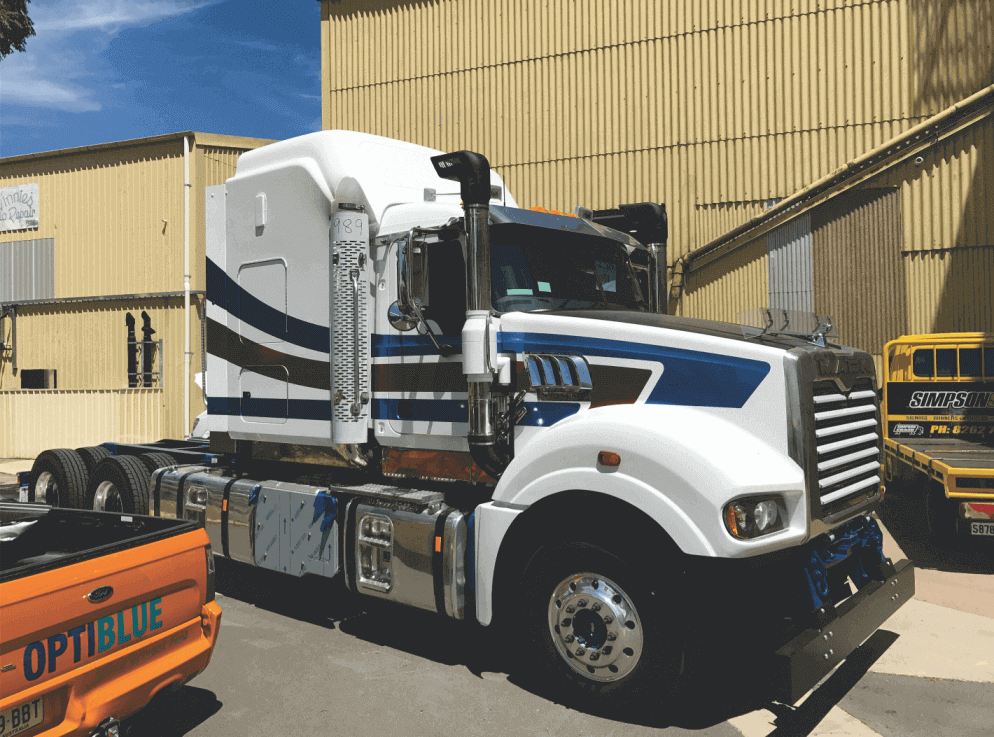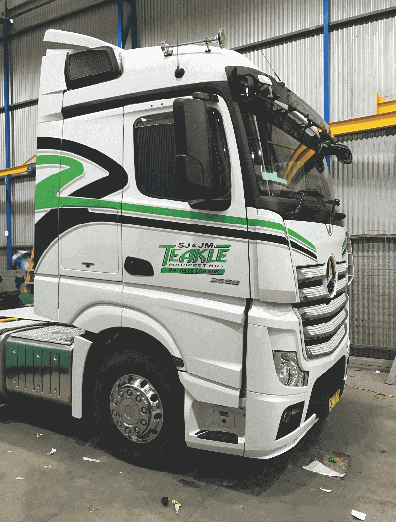 A striking sign-writing job on this large semi-trailers cabin shows the company name, sign written, plus large vinyl cut transfers, featuring lightning strikes